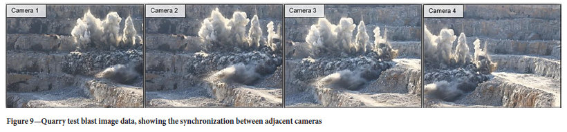 Figure 9 illustrates the synchronization between adjacent cameras actuated via the remote triggering system approximately 500 m from the cameras. By comparing the dust plumes from each image, it is evident that three of the four cameras (cameras 2, 3, and 4) are very closely aligned. Camera 1 seemed to have taken its image slightly earlier than the other cameras; however, the error produced by this can be reduced by averaging the measurements taken per stereo model (i.e. images of the same point in time taken by two adjacent cameras) for each point in time. If four cameras are used for a blast, a total of six stereo models can be created per point in time, from which positional measurements of key fragments can be taken.