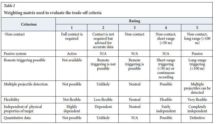 The different techniques and technologies were evaluated using a weighting assigned for each criterion. The detailed decision matrix is given in Table I.