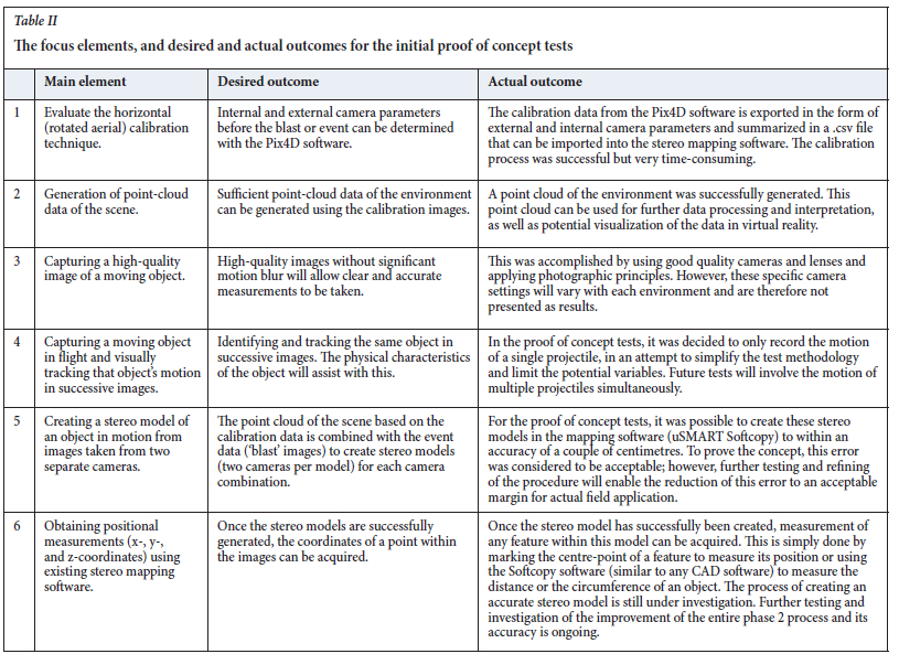 Based on this analysis, it is apparent that a visual or optical approach is the best option to acquire flyrock flight data that can be analysed and quantified mathematically. An essential criterion is, therefore, to obtain quantitative data or measurements from the field data collected. Photogrammetry is a technology that has a well-established quantitative element is, and data processing using photogrammetry is also relatively manual compared to automated detection and tracking technologi es. This is so as to enable the operator to measure and control any measurement or calculation errors throughout the process, and not only at the end of the process. The main drawback is that photogrammetry may not be very flexible in terms of commercially available software.