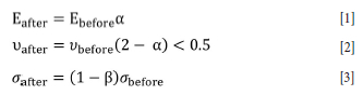 In the destress blast evaluation model, Sainoki et al. (2017) adopted the concept of rock fragmentation factor (α) as introduced by Blake (1972) as per Equation 1. The concept is based on the observation that effective destress blasting leads to the widespread extension of cracks existing in the rockmass and generation of more cracks, leading to significant stress release ahead of the mining drift face. When this happens, the stiffness of the rockmass is significantly reduced, resulting in a much lower elastic modulus compared to the elastic modulus before destressing. As expected, the elastic modulus of the rockmass remains about the same when α is 1; that is when there is little to no rock fragmentation before destressing. In rock mechanics terms, the softening of the rock due to action of stress can be explained using the Poissons effect. The changes in Poissons ratio before and after destress blasting, can also be used to evaluate the efficiency of a destress blast design using Equation 2, as suggested by Tang and Mitri (2001) as per Equation 2. When α is 1 (relatively unfragmented rockmass), the Poissons ratio remains almost the same. When α is 0 (significantly fragmented rockmass) the Poissons ratio almost doubles, signifying enormous softening of the rockmass due to destress blasting.