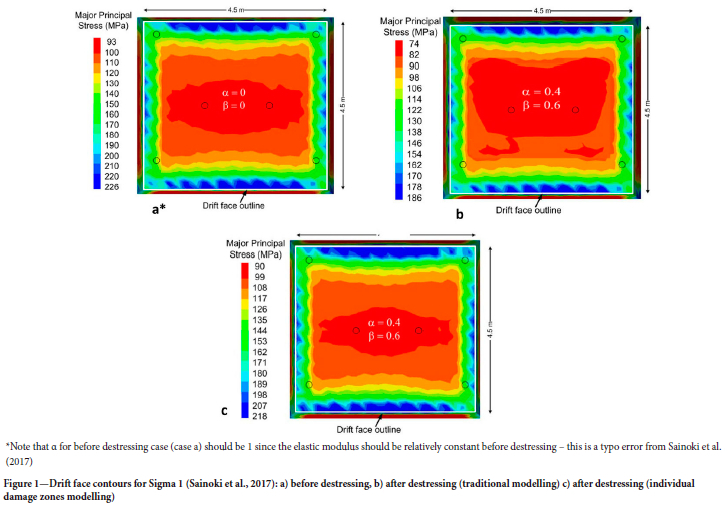 To maintain some modicum of brevity of this paper, and yet cover key issues relevant to the successful use of numerical modelling as a destress blasting design tool, this discussion zooms into and shines the spotlight on the work by Sainoki et al. (2017). Sainoki et al. (2017) warn that traditional ways of modelling, which assume that the damage zone induced by the destress blast is spread over the whole drift face, may result in overly optimistic destress blast results. This is a result of the models predicting lower than actual resultant stresses around the destressed excavation due to oversimplification of the prevailing conditions in the rockmass. To mitigate against this, Sainoki et al. evaluated the damage of each hole individually and obtained results more reflective of prevailing ground conditions after preconditioning as shown in Figure 1. Assessing the major principal stress (MPa) legend for each case in Figure 1, it can be noted that the stress drops from a maximum of 226 MPa (before destressing) to 186 MPa and 218 MPa for the traditional modelling case and the individual damage zones modelling case, respectively. This shows that the traditional modelling approach potentially underestimates the peak major principal stress after destress blasting by about 32 MPa in this scenario.