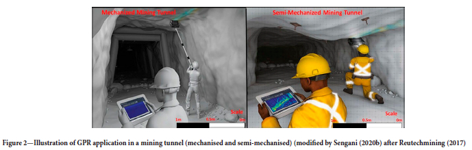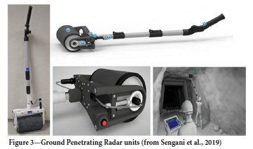 In the study of application of destress blasting to manage seismic hazard, Sengani (2020b) noted that the application of the ground penetration radar technique successfully identified seismic and non-seismic hazards, which could not be identified through conventional and numerical evaluations in hardrock mining. Fractures in the rockmass and geological structures causing breaks in the rockmass (discontinuities) can be picked using the GPR technique. The technique uses the geophysics approach of rapidly reflecting electromagnetic waves at high resolution in a scan target, providing vital information about the distribution of rockmass discontinuities. Sengani (2020b) provides an account of the theoretical background of the GPR and its application in different fields including archaeology, construction, mining, exploration of gem tourmaline pockets and vugs, identification of voids and cavities, and assessing the depth of a water table. Sengani (2020b) notes that, although GPR has been extensively used in mining and construction (Shi et al., 2018; Liu et al., 2018; Hao et al., 2016; Fedorova et al., 2016; Moradipour et al., 2015; Ralston, Strange, 2015; Lualdi, Zanzi, 2004; Jha et al., 2004; Toper et al., 1999; Ralston et al., 2001; Ralston, Hainsworth, 1999; Hainsworth et al., 1999; Murray et al., 1996; Noon, 1996; Chufo, Johnson, 1993; Mowrey et al., 1995; Daniels, 1980; Ellerbruch, Belsher, 1978), there are few studies, which cover particular application of GPR in rock mechanics (Sengani et al., 2019; Sengani, Zvarivadza, 2018a; Sengani, Amponsah-Dacosta, 2018; Sengani, Zvarivadza, 2017; Toper, 2003; Grodner, 2001). Figure 2 illustrates the application of GPR in a mining tunnel.