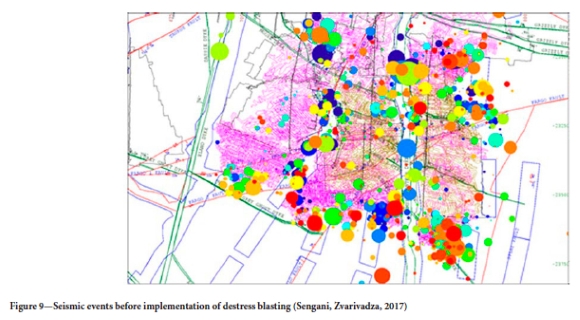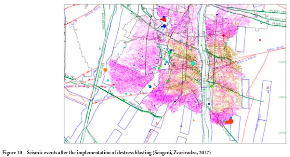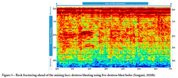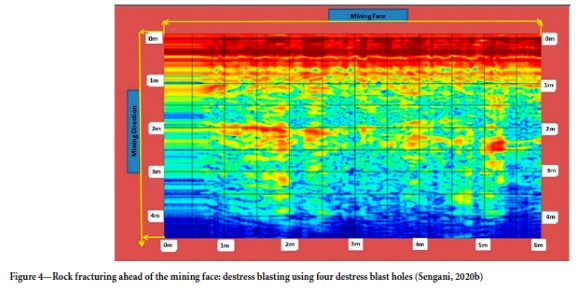To gauge the effectiveness of an adopted, destress blast design, evaluation of the rock fracturing ahead of the mining face after the blast can be done. Effective destress blasting is expected to create or extend a network of fractures, which connect the destress blast holes sockets. This is critical in assessing the most optimum number of destress blast holes to use with the production blast holes. The network of fractures provides a path for stress relief from the immediate vicinity of the blasting face into the rockmass. The intensity of fracturing ahead of the mining face due to destress blasting can be assessed using ground penetrating radar, borehole periscope, and mining face drill core discing observations.