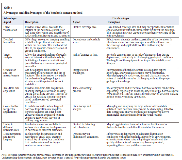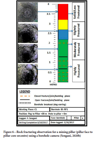 As expected, the fracturing is high in the immediate vicinity of the pillar face and decreases towards the pillar core. Table 4 gives the advantages and disadvantages of the borehole camera method.