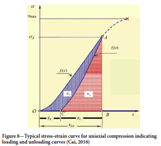 The principle of F is premised on the observations of strain energy (area under a stress-strain curve of a rock sample) changes when a rock sample is uniaxially compressed to 80% of its maximum uniaxial compressive strength and the load is released gradually to zero. Since loading the specimen to 0.8UCS makes transition from elastic behaviour to plastic behaviour, permanent damage is experienced by the specimen, leading to strain energy being spent on plastic deformation (represented as Wsp (area OAC) in Figure 8). The total strain energy generated in the specimen when it is uniaxially compressed to 0.8UCS is represented as Wtot (area OAB in Figure 8). The strain energy stored in the specimen (Wst) is the difference between Wtot and Wsp. From the work of Kidybinski (1981) and Wang et al. (1998), F is defined as the ratio of Wst to Wsp and Equations 4 to 7 are used in the formulation of the ratio using Figure 8.