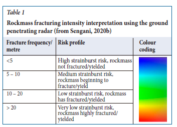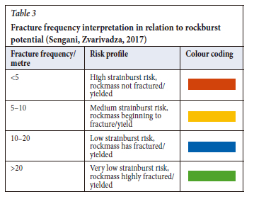 The intensity of fracturing ahead of the mining face can be assessed using colour coding, as presented in Table 1. Dark red colour indicates a fracture frequency of more than 20 fractures per metre and dark blue colour represents a fracture frequency of less than 5 fractures per metre.