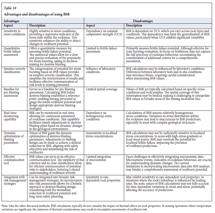 Several studies shed more light on the concept of BSR, coverage of which is significant to destress blasting studies. These studies include the following: Rojas-Perez et al., 2024; Shnorhokian, Ahmed, 2024a; Kabwe et al., 2023; Zhang et al., 2023b; Shnorhokian, Mitri, 2022; Vennes, Mitri, 2022; Heidarzadeh et al., 2021; Heidarzadeh et al., 2020; Vennes et al., 2020; Sainoki et al., 2019; Vennes, 2019; Zhou et al., 2018; Shnorhokian et al., 2018; Vennes, Mitri, 2017; Vennes, Mitri, 2016; Sainoki et al., 2016; Shnorhokian et al., 2015; Shnorhokian et al., 2014. The advantages and disadvantages of using BSR for rockburst prediction and destress blasting design and evaluation are presented in Table 10.