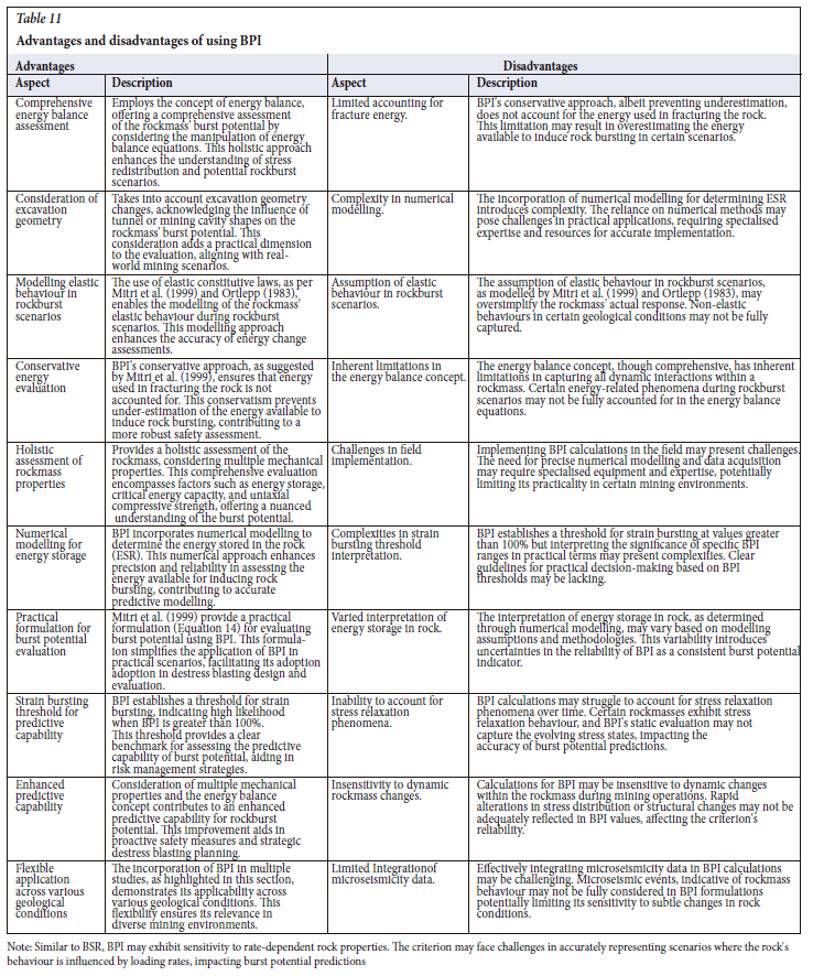BPI provides a holistic assessment of the rockmass, considering multiple mechanical properties. This comprehensive approach enhances the predictive capability of rockburst potential. Evaluating changes in BPI before and after destress blasting aids in optimising blasting parameters. A decrease in BPI signifies positive modifications in the rockmass properties, indicating successful destress blasting. The advantages and disadvantages of using BPI for rockburst prediction and destress blasting design and evaluation are presented in Table 11.