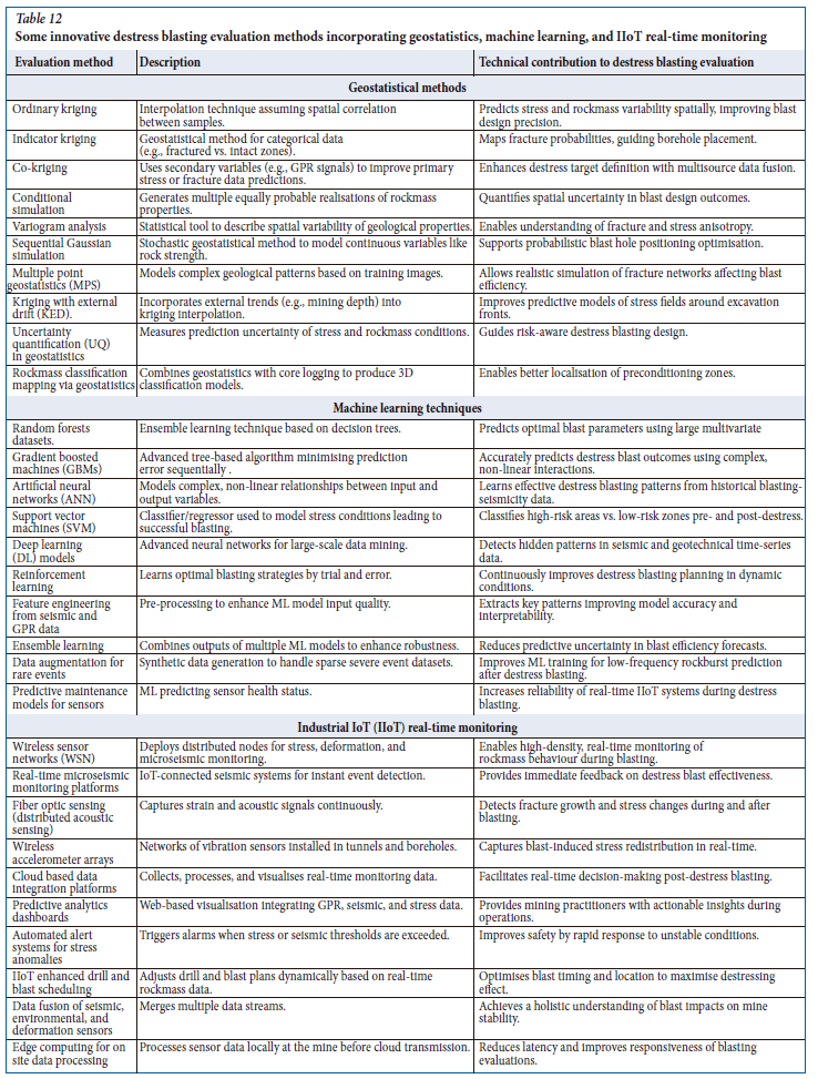 Destress blasting has been studied in various underground mining contexts, with notable contributions focusing on its theoretical basis, practical implementation, and field performance assessments. Early studies by Roux et al. (1957), Cook et al. (1966), and Blake (1972) introduced the concept of preconditioning brittle rockmasses to mitigate rockburst hazards. Subsequent investigations expanded on these ideas, developing numerical models and field validation techniques to refine destress blasting strategies (Miao et al., 2022; Tang, Mitri, 2001; Andrieux, Hadjigeorgiou, 2008). These studies highlighted key design considerations, including the need for appropriate explosive energy levels, borehole configurations, and initiation sequences tailored to specific geological settings. One of the primary research gaps in existing literature is the challenge of accurately predicting and quantifying the effectiveness of destress blasting. Traditional evaluation methods have relied on empirical observations and qualitative assessments, which, in as much as informative, lack the predictive capability needed for optimising blast designs in variable rockmasses. More recent studies have employed numerical modelling approaches, such as finite element and discrete element methods, to simulate stress redistribution and fracture propagation resulting from destress blasting (Miao et al., 2022). These models, however, often require extensive calibration and may not fully capture the complex interactions between pre-existing geological discontinuities and blast-induced stress waves. Another limitation in current research is the lack of standardised criteria for assessing destress blasting performance. Various metrics have been proposed, including stress dissipation factors, elastic modulus reductions, and seismic event reductions (Sainoki et al., 2017). The relative effectiveness of these criteria remains an open question, particularly in the context of different mining environments. Despite microseismic monitoring having been used to track stress changes following destress blasting, there is a need for more refined methodologies that integrate multiple data sources, including geophysical surveys, borehole imaging, and numerical simulations to provide a comprehensive evaluation framework.