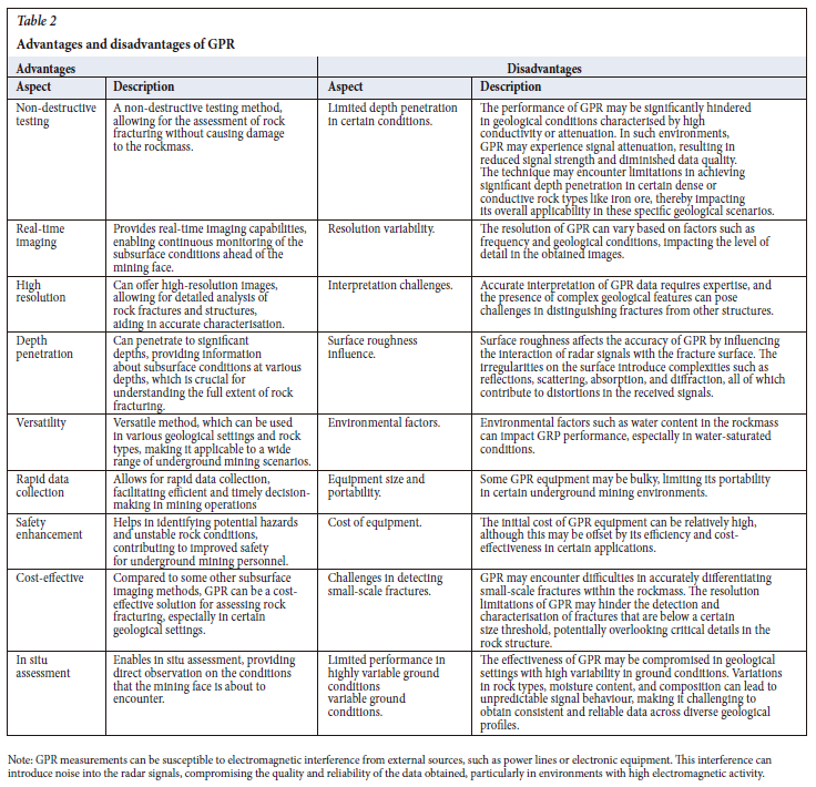 Understanding both the advantages and disadvantages of using GPR allows for a balanced assessment of its suitability in specific underground mining contexts. Consideration of geological conditions, expertise in data interpretation, and the specific goals of the mining operation are crucial in determining the effectiveness of GPR for assessing rock fracturing ahead of the mining face. The advantages and disadvantages of GPR are presented in Table 2.