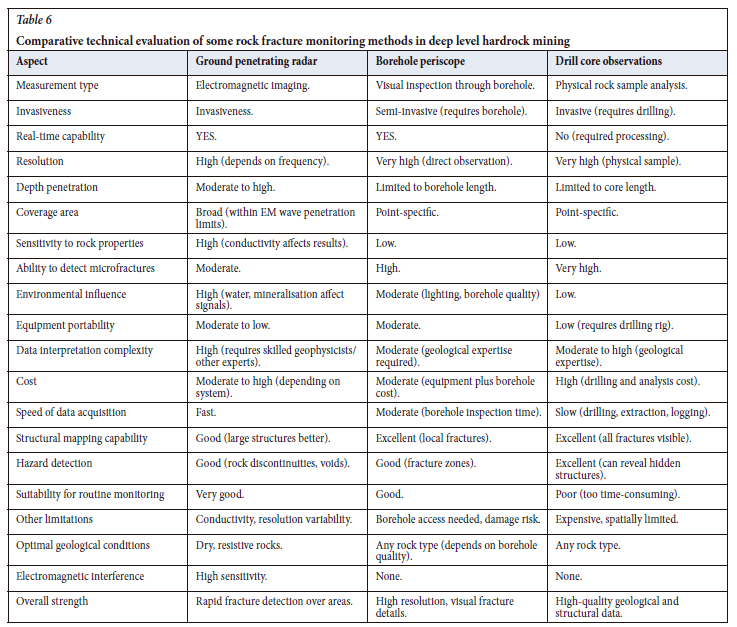 The significance of considering environmental factors, such as water content in the rockmass, cannot be overstated. The performance of these methods, particularly GPR, may be influenced by factors like water saturation, impacting their effectiveness. The issue of electromagnetic interference is also raised, where external sources like power lines can compromise the quality and reliability of data obtained. Such considerations highlight the need for a holistic approach that incorporates not only the technical aspects of these methods but also the external conditions that may affect their performance.It can be noted that the evaluation of rock fracturing ahead of the mining face is a multifaceted task that requires a careful balance between various techniques. The advantages of non-destructive testing, real-time imaging, and high-resolution analysis must be weighed against limitations in depth penetration, resolution variability, and interpretational challenges. The application of these methods should align with the specific goals of the mining operation and the geological context, ensuring a comprehensive and reliable assessment of rockmass conditions.To further assist readers in appreciating the relative strengths and limitations of different rock fracture monitoring methods, a detailed side-by-side technical comparison of ground penetrating radar, borehole periscope inspections, and drill core observations is presented in Table 6.