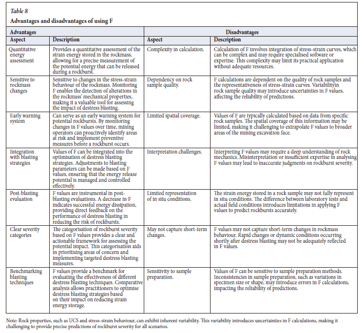 The advantages and disadvantages of using F for rockburst prediction, and destress blasting design and evaluation are given in Table 8.