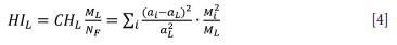 This parameter can only be rarely estimated so it is replaced by using the idea of fragment heterogeneity via the heterogeneity invariant (HIl) or intrinsic heterogeneity (IHl), which is far easier to define (Gy, 2004; Pitard, 2019). This accounts for the intrinsic fragment variability and quantifies the relative sampling variance, which sums the squared deviations of individual fragment grades (ai) and masses (Mi) from the lot average: