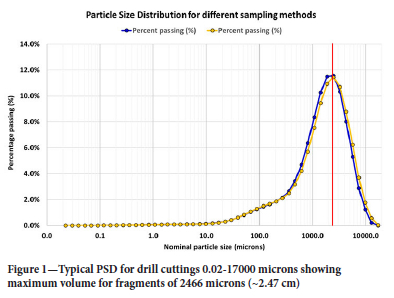 A typical procedure for sampling drill cuttings involves laying a tarpaulin around the hole to prevent ground contamination and using triangular sectoral trays to collect samples continuously over a 3-metre drill depth. For a 200 mm drill hole, this depth produces approximately 270-300 kg of cuttings, from which 35-40 kg is collected and split into two 5 kg samples for PSD and chemical analysis. These samples are compared to ensure consistency and representativeness. A typical PSD for two samples of drill cuttings 0.02-17000 microns showing maximum volume for fragments of 2466 microns (2.47 cm) is shown in Figure 1.