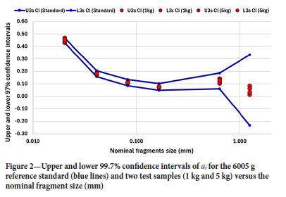 The 3 upper and 3 lower confidence intervals for the reference standard (Table 3, columns 4 and 5), calculated using Equation 12 are plotted against the nominal fragments size (mm) as shown in Figure 2 and form an important starting point for the Minkkinen et al. (2015) analysis.