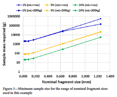 Table 4 shows how the theoretical minimum sample size depends on the required uncertainty of sampling given as the relative standard deviation: 1%, 5%, and 10%. It quantifies the precision-cost trade-off by demonstrating how the minimum sample mass (ms) scales nonlinearly with the desired precision (sr(req)). For instance, reducing sr from 10% to 1% requires a 100-fold increase in ms (Equation 13). This sensitivity is critical for cost-benefit decisions. Sample sizes were calculated for two different lot sizes: 200 kg (sample taken from a pile) and from a lot much larger, about 20 t, than the sample (primary sample taken from a large target). Where high precision is required, as in compliance testing, a 147 kg sample is required for 1% Sr in the coarsest fraction (Table 4). For less demanding precision such as exploration sampling a 10% Sr may suffice, allowing smaller samples (1.47 kg). The exponential relationship (Figure 3) underscores the trade-off between precision and operational feasibility. The changes in sample mass for a change in nominal fragment size are shown in Figure 3.