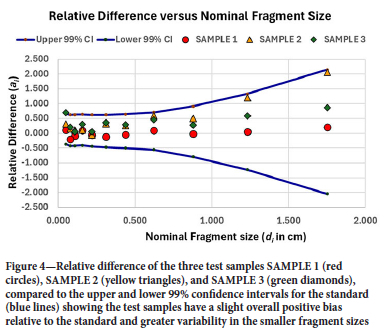 The upper and lower confidence intervals for the 1 kg and 5 kg test samples are plotted as points which all lie between the CIs of the reference standard, indicating that they are acceptable and thus representative of the PSD derived by the test methods.