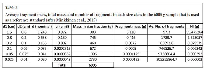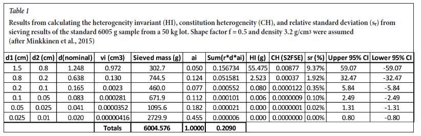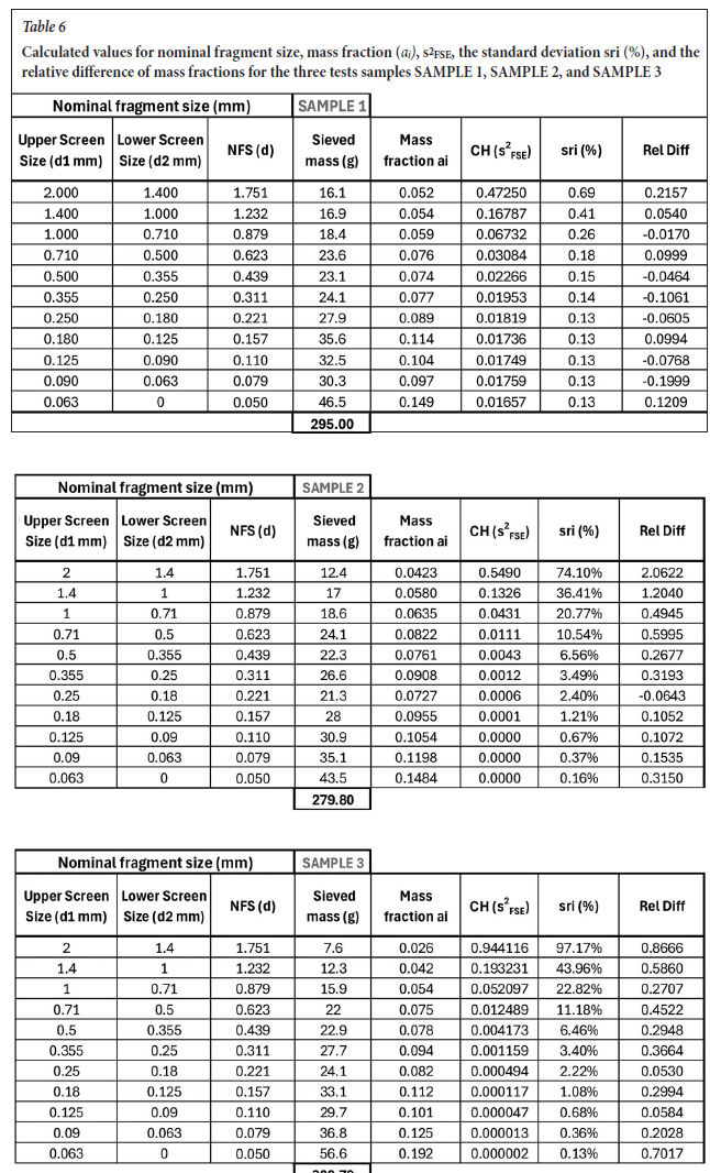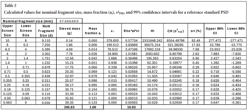Table 1 provides a linear sequence of calculations, including the nominal fragment size, the mass fraction (ai), the heterogeneity invariant (HI, Equation 5), and the fundamental sampling error (CH, Equation 11), the standard deviation (sr %, Equation 9), and the lower and upper confidence limit calculations for the reference standard. The average fragment mass per size fraction (vi*density), total mass of fragments, and the average number of fragments in each of the six size classes sieved from the 6005 g standard sample are shown in Table 2.