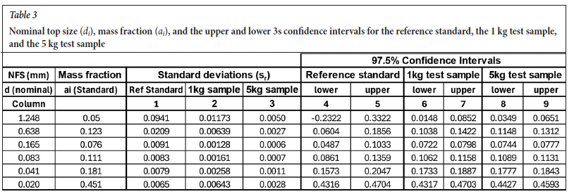 Table 3 shows the confidence intervals for the mass fractions (ai) in each size fraction for the reference standard as well as for 1 kg and 5 kg tests samples, calculated using the experimental HI values (Equation 1). Confidence intervals of the 1 kg and 5 kg samples can now be placed in the framework for the standard sample, as shown in Figure 2.