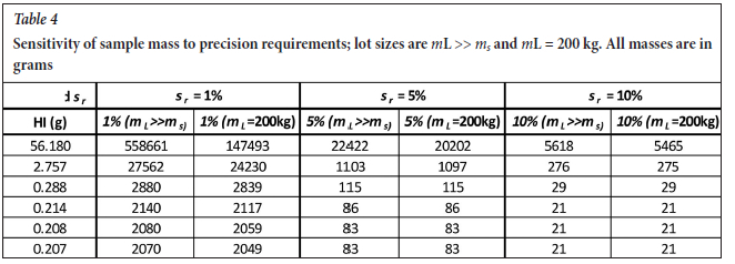 The sampling variance of a particle mixture is a function of the number of the analyte particles in the sample. When the particle size is reduced, the number of fragments rapidly increases and, as a result, HI decreases (Table 2). If a reliable result for the coarsest fraction in the sample is necessary, then the number of the analyte particles determines the minimum sample size that should be used.