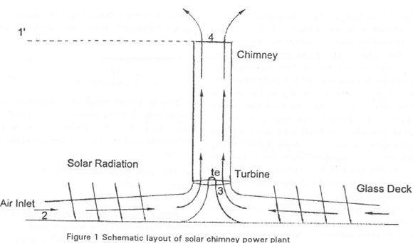 A solar chimney power plant consists of a large area covered by glass or translucent plastic sheets to collect solar energy. A central, high chimney, containing a power generating turbine at its base, allows the hot air to escape. Haaf et al.1 and Haaf2 discussed the operation of a prototype solar chimney plant.