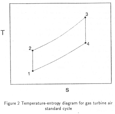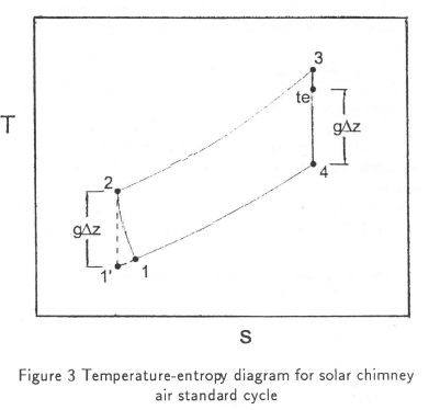 Although the air standard gas turbine and solar chimney cycle T-s diagrams are similar, there are some differences. In the gas turbine cycle, energy is transferred from the turbine to the compressor as shaft work, that is, energy is extracted from the cycle by the turbine and reintroduced by the compressor. In the solar chimney cycle there is an internal exchange between enthalpy and geopotential energy in the chimney, and the process is reversed in the external environment. In spite of the differences the gas turbine air standard cycle analysis can be applied directly to the solar chimney cycle since similar enthalpy and entropy changes occur in the two air standard cycles.