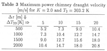 • By assuming a value of a pressure loss coefficient, K = 2, and that the maximum power that can be extracted occurs when two-thirds of the pressure drop is across the turbine, the required chimney velocity can be derived as Vc = √(1/3) √{P/m).