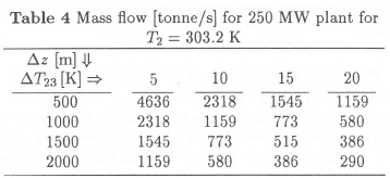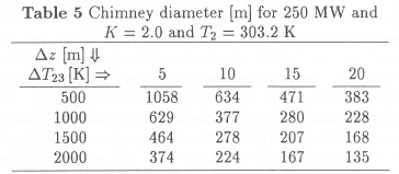 Table 8 shows that a 250 MW plant with T4 = T2 would require a chimney diameter of about 200 m.