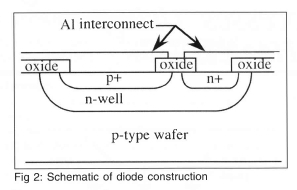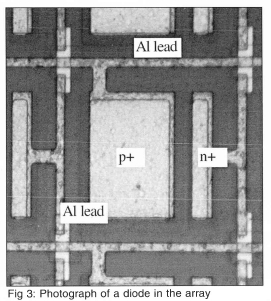 A 32 X 32 p-n junction isolated diode array was built on a p-type wafer using VLSI techniques. A schematic of a single diode is shown on Fig 2. First, a mask was used to create a series of n-wells on the wafer. A second mask was used to implant boron to create regions of p+. A third mask was used to create regions of n+ to make a well contact by diffusing phosphorous. A fourth mask was used to open a contact via the electrical contact to the diode. Finally, a fifth mask was used to interconnect the diodes in the array. Each individual diode is 0.1 mm X 0.1 mm in size, with the entire array being 3.2 mm x 3.2 mm in size. A photograph of a single diode in the array is shown on Fig 3.