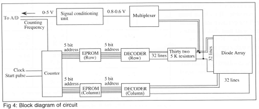 A schematic of the circuitry used to scan the diodes in the array and provide signal conditioning is shown in Fig 4. The circuit receives two external signals: a start pulse and a signal from an external clock, both of which enter the counter. The start pulse tells the counter to begin counting, while the external clock is used to set the frequency at which counting occurs. The actual counting frequency is half the clock frequency. Counting frequencies of up to 2.5 MHz are possible with the current circuitry. The signal exiting the counter enters two Erasable Programmable Read Only Memories (EPROM), one for choosing the row and one for choosing the column. Everytime a pulse from the clock enters the EPROMs, they output two 5-bit digital signals corresponding to row and column numbers. In the present configuration, the EPROMs are programmed to increment the column number from 1 to 32 before incrementing the row number. All of the diodes in a particular row are therefore scanned before going on to the next row. The entire array is scanned once every time the circuit receives an external start pulse.