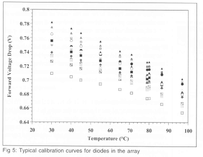 Calibration of the diode array is performed by placing it in a uniform temperature environment, and measuring the forward voltage drop of each diode as a function of temperature. For typical diodes, the forward voltage drop decreases by about 2 mV/°C around room temperature. Typical calibration curves for a few diodes in the array are shown on Fig 5. Measurement of temperatures to within 1°C is easily achievable.