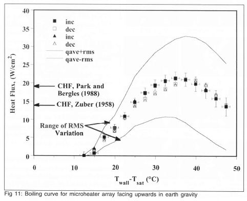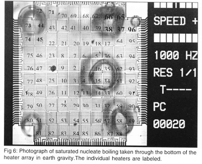 Boiling is a complex phenomenon where hydrodynamics, heat transfer, mass transfer, and interfacial phenomena are tightly interwoven. It is of importance to processes such as heat exchange, cryogenic fuel storage and transportation, electronic cooling, and material processing due to the large amounts of heat that can be removed with relatively little increase in temperature. An understanding of boiling and critical heat flux is important to the design of heat removal equipment. Although much research in this area has been performed over the past few decades, the mechanisms by which heat is removed from surfaces by boiling are still unclear. Over the past few years, we have used the microheater array to document the pool boiling behavior in earth and microgravity environments. Examples of the heater performance in these environments is given below.