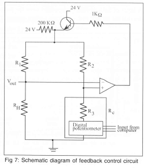 The temperature of each heater in the array is kept constant by feedback circuits similar to those used in constant temperature hot-wire anemometry as shown in Fig 7. The op-amp measures the imbalance in the bridge and outputs the necessary voltage to keep the ratio RH/R1 equal to RC/R2. The temperature of the heater is controlled by changing the wiper position of the digital potentiometer. The instantaneous voltage required to keep each heater at a constant temperature is measured (Vout) and used to determine the heat flux from each heater element. The large 200 KΩ resistor at the top of the bridge is used to provide a small trickle current through the heater, and results in a voltage across the heater of about 100 mV even when the op-amp is not regulating. Because all the heaters in the array are at the same temperature, heat conduction between adjacent heaters is negligible. There is conduction from each heater element to the surrounding quartz substrate (and ultimately to the walls of the chamber where it was dissipated by natural convection), but this can be measured and subtracted from the total power supplied to the heater element, enabling the heat transfer from the wall to the fluid to be determined.