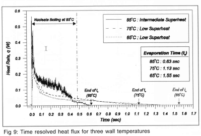 The time variation in wall heat flux over the droplet evaporation time for three wall temperatures is shown in Fig 9. The droplet evaporation time is seen to decrease with increasing wall temperature. The trace for a wall temperature of 85 °C contains a high frequency component from drop impact to about 0.42s. Correlation with the high-speed video indicated that this activity was due to nucleate boiling within splat. Very few bubbles were observed after 0.42s, indicating the end of boiling.