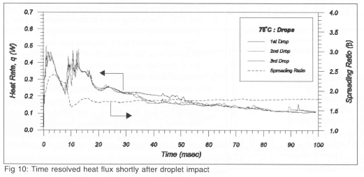 When a droplet strikes a heated surface, it flattens into a thin disk or splat with a thickness which is much smaller than the diameter of the droplet, and high heat fluxes can be obtained due to the formation and evaporation of a thin liquid film on the heated surface. This process is of importance to several industrial applications such as electronic cooling and cooling of steel slabs. A fundamental study of the evaporative heat transfer from a hot surface when a droplet of FC-72 (Tsat=57°C at 1 atm) strikes it was performed (Lee, et al.8). A schematic of the setup is shown on Fig 8. Data from the heater array was sampled at 3000 Hz and synchronised with high-speed digital video of the droplet striking the surface. Before the droplet impacted the heater array, the power supplied to each heater is lost only by substrate conduction (the small natural convection from the top and bottom of the substrate was neglected). Because the heater was held at constant temperature, the substrate conduction remained constant even after droplet impact, enabling the heat transferred from the heaters to the liquid to be determined.