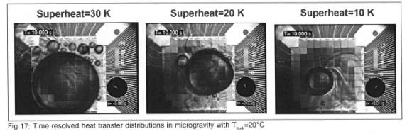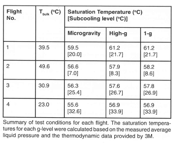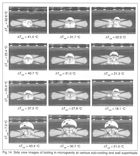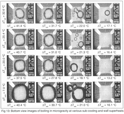 Measurement of boiling in a low gravity environment (0.02 grms) was obtained using NASA's KC-135 aircraft in May 2001. In this series of flights, the bulk liquid temperature was varied from 20°C to 50°C (sub-cooling from 36°C to 6°C), and measurements were made to wall superheats up to 100°C. A summary of the test conditions is given on Table 1. Analysis of this data set is not complete, so the following results should be considered preliminary. Single frames from the high-speed video over the entire range of test conditions obtained through the bottom of the heater are shown on Fig 13. A large primary bubble is seen to form with a size on the order of the heater array. This bubble formed from the coalescence of smaller bubbles that grew on the surface after transition into microgravity.