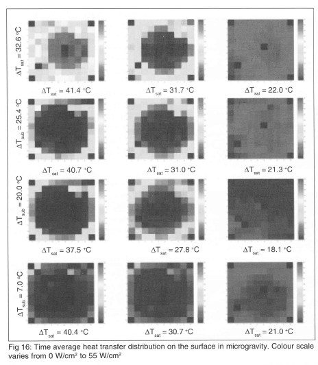 The time averaged heat flux distribution from each heater in the array is shown on Fig 16. The scale has been kept the same for all images to highlight the change in heat transfer with wall superheat and sub-cooling.