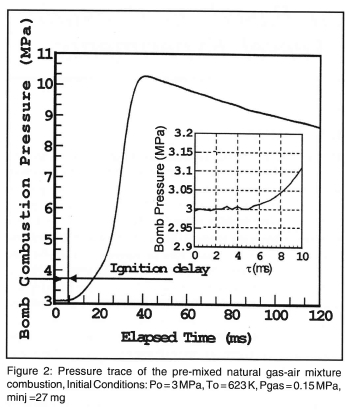 Many of previous studies on DF ignition delay have been performed in engines. Nielsen et al1 used a single cylinder diesel engine to study the ignition delay, where it was noted that the ignition delay was significantly increased by the presence of NG. For example it was shown that the presence of 2 % methane in the intake air doubled the ignition delay period. They suggested that part of this delay was caused by a thermal effect; that is introducing the methane into the combustion chamber changed the specific heat of the mixture and thus lowered the compression temperature. Also, it could have been a chemically inhibiting effect of the presence of methane on the diesel fuel reaction rate. However their results didn't firmly verify their hypothesis.