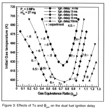 The determination of a correlation law allowing the prediction of ignition delay period requires the knowledge of the main parameters influencing the delay. These parameters are experimental conditions in the chamber (i.e. pressure, temperature and the diesel fuel characteristics). Thus, experiments have been carried out over a wide range of temperatures (570 - 690 K), pressures (1.4 - 4.0 MPa), mass of pilot diesel injection (3-57 mg) and NG partial pressures (0.05 MPa to 0.3 MPa) which gives an NG/air equivalence ratio φgas of 0.17-1.8. As it can be seen that the pre-ignition temperatures were a little lower than those normally experienced in diesel engine operation (i.e. 3 MPa, 800 K) as it was found that the higher temperatures could spontaneously ignite the pre-mixed NG-air mixture.