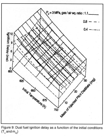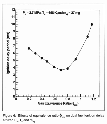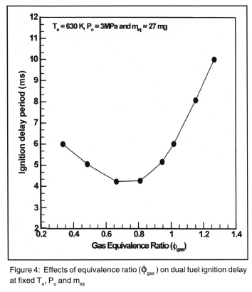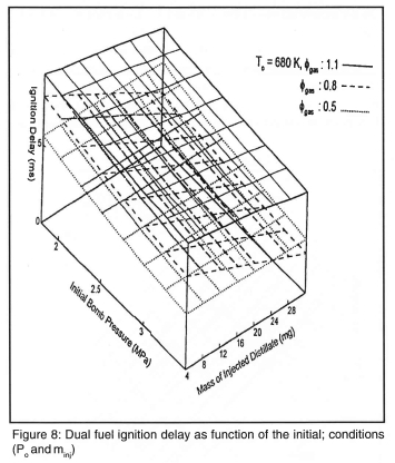 Investigation has been carried out by Liu and Karim2 on factors affecting the ignition delay period of a DF engine. They used a detailed reaction kinetic scheme for the oxidation of the gaseous fuel and employed an experimentally based formula for the ignition delay. They observed that the values of the ignition delay in DF operation strongly depend on the type of gaseous fuel used and its concentrations in the cylinder charge. The associated changes in the charge temperature during compression, pre-ignition energy release, external heat transfer to the surroundings and the contribution of residual gases appear to be the main factors influencing the length of the ignition delay period of the DF engine.