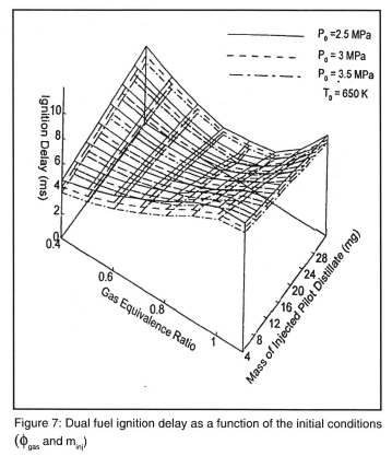 Mtui and Hill4 used multi-cylinders two-stroke diesel engine to investigate the ignition delay of the DF operation. They concluded that with gas/diesel fuelling and appropriate injection timing, ignition delay and combustion duration could be the same as 100% diesel liquid fuelling. Their flame photography and mass-burned determinations indicate that there is no appreciable effect of the presence of the NG on the ignition delay. The timing of the first appearance of the flame does not change significantly if the injection of diesel fuel is stopped. This is in contrast to the findings of Liu and Karim2.