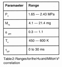 Equation (1) therefore provides a good starting point for a modification of DF ignition delay correlation developed by Hu and Milton5.Their correlation was based on the pre-ignition pressure and temperature experimental data which were below those temperature and pressure of the conventional diesel engine at the point of injection. Using different functional forms of To, Po, φgas and minj, a regression analysis of the experimental data gave an ignition delay correlation, which is applicable to the combustion vessel at delay times less than 30 ms. Above 30 ms delay, the ignition and subsequent combustion were unreliable. Nevertheless, 30 ms corresponds to 108° of crank angle at 600 rpm and is therefore well in excess of that which is applicable in engine operation. The correlation of Hu and Milton5 is as follows: