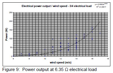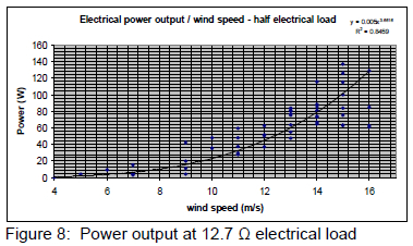 The test wind turbine shown in figure 1 was tested by mounting it on a moving vehicle and driving the vehicle at various speeds thereby simulating various wind speeds. The tests were conducted during low ambient wind conditions thereby simulating the reduced turbulence that the turbine would experience when mounted on a high mast. The lowest part of the turbine was positioned at a height of 2.3 m above the vehicle to ensure that little or no aerodynamic interference occurred between the vehicle and the turbine. The test setup allowed data to be logged for performance over a wide range of wind speeds in a relatively short space of time. Tests were conducted with three different resistive loads applied to the generator. Figures 7, 8 and 9 display the measured data. Electrical power output was obtained by using the product of the voltage and amperage readings recorded. Wind speed and rotor speed were also recorded. A logging interval of 2 s was used throughout.