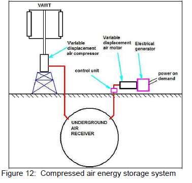 The power coefficients of various types of wind turbines are shown in figure 11 as well as that of the test wind turbine. The performance obtained was very similar to the American multi-blade type but at a lower λ. The potential exists to improve the Cp over that obtained by means of further experimentation and research, particularly with regard to the optimum aerofoil aspect ratio. Figure 12 shows the arrangement of a compressed air energy storage system14 which should be ideally suited to the wind turbine described in this research.