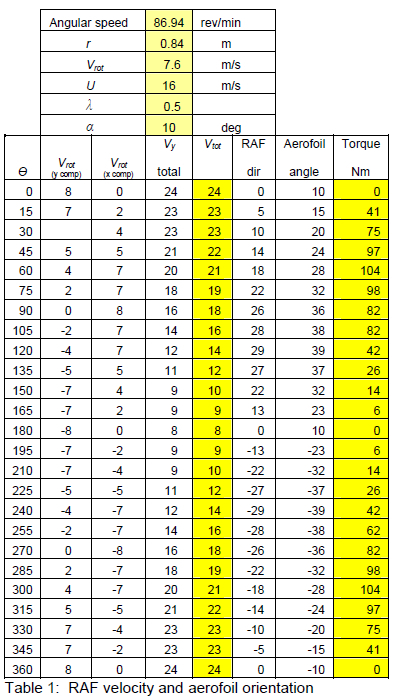 This would be the theoretical power produced by one aerofoil, neglecting aerofoil drag losses as well as wake effects between aerofoils. Due to the low solidity of the device and the low λ the method used should provide a reasonable approximation of power output. The calculations assume that sufficient resisting torque was applied to the output shaft to maintain the chosen speed.