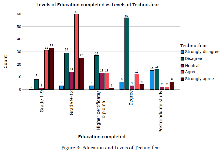 A chi-square test of independence showed that there was a significant relationship between age and techno-fear (x2 = 23.2, df = 8, p = 0.02). A further analysis revealed that there was a significant relationship between techno-fear and the level of education (x2 = 206.45, df = 16, p = 0.00). An observation of the cross-tabulated data indicate that high levels of techno-fear are associated with respondents who are not highly qualified and low lever levels of techno-paranoia are associated with respondents who have higher levels of qualification. The preceding observation is corroborated by the cross-tabulation of the level of education with techno-fear as illustrated in Figure 3.
