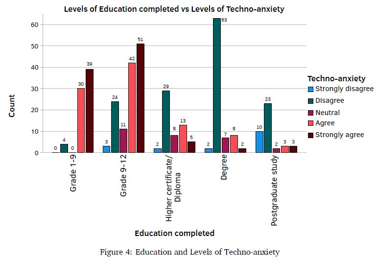 A chi-square test of independence showed that there was a significant relationship between age and techno-anxiety (x2 = 18.84, df = 8, p = 0.02). A further analysis revealed that there was a significant relationship between techno-anxiety and the level of education (x2 = 207.58, df = 16, p = 0.00). The preceding observation is corroborated by the cross-tabulation of the level of education with techno-anxiety as illustrated in Figure 4.