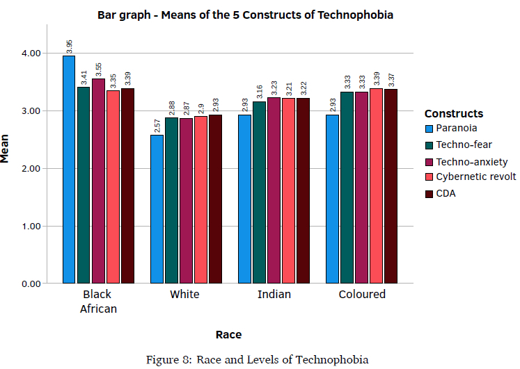 However, the majority of the participants of the white race demonstrated lower levels of technophobia in comparison to the non-white respondents. This can be attributed to socio-economic disparities during the apartheid era where race and geographic location determined access to technological infrastructure, opportunities, and education (Makhado & Tshisikhawe, 2020). This resulted in unequal access to technology and employment opportunities amongst individuals of different races, with the privileged white monitory enjoying the best access.