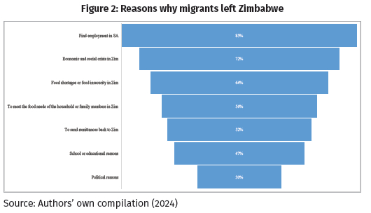 More than half of the survey participants indicated that they departed Zimbabwe to seek economic and income-generating opportunities that would enable them to send back remittances (52%) and meet the food needs of the migrant-sending families and households (56%). Other migration drivers included school or educational reasons (47%) and evading political hostility (30%). Figure 2 shows the reasons why migrants left Zimbabwe.