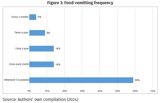 Strikingly, the use of digital-mobile food transfer passages facilitated the transmission of perishable food commodities. The transfer of these food items is enabled by advanced digital-mobile services, which have amenities for beneficiaries of the transferred items to collect their food commodities in Zimbabwe instantaneously when the transactions in Cape Town are completed. Participants were asked about the frequency of food items being remitted to Zimbabwe. Considering the economic and COVID-19 pandemic challenges, such as retrenchments, joblessness and job losses, and loss or absence of reliable income sources (Tawodzera and Crush, 2022), most Zimbabwean migrants specified reduction in transfers and did not have predetermined periods to transfer food commodities to households in Zimbabwe. Thus, 59% remitted food whenever possible, 14% monthly, 14% once annually, 9% twice annually, and 4% were able to transfer food remittances to Zimbabwe every three months (see Figure 3).